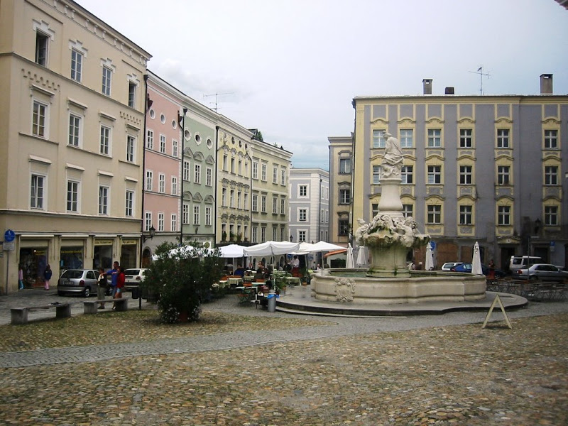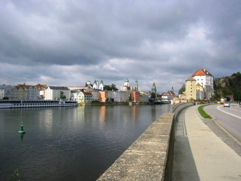 We left in a car with bikes on the roof. We left the car inViennaat a Park & Ride. From there, cycle through Vienna to the train station. I bought tickets at the station. I was offered to buy seats, but I didn't, which I regret. The bicycles rode in the bicycle wagon, we stood in the corridor. On the way there was a change in Linz. The next train was slower, and the bicycle carriage also had seats. Like other cyclists, we got into the bicycle wagon. We rode on benches next to bicycles toPassau (German:Passau). It was already afternoon, so we immediately looked for accommodation. We had barely left the station when a hotel with unusual architecture appeared somewhere around the corner. We asked about accommodation. They were inexpensive, and he also had a special place to store bicycles. Then a walk around Passau – market square, cathedral.