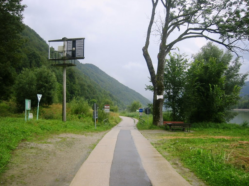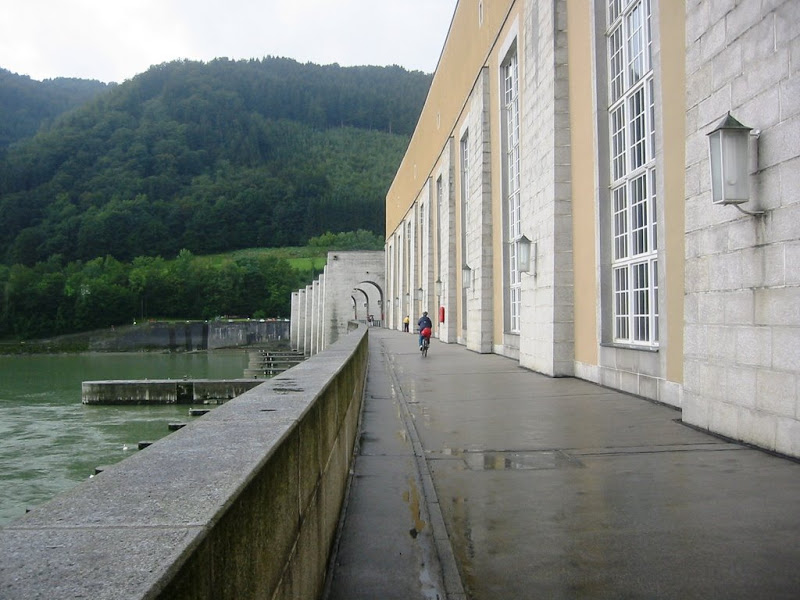We set off on the road in the morning. The road runs along the border with Austria. There's a hydroelectric power plant on the way, where we get caught in the rain. We visit the power plant. It stops raining, so we move on. We cross the border with Austria, i.e. we pass a barrier that stands as a reminder of the former border crossing. We are IN Austria. We enter the area of the beautiful meanders of the Danube. The trail moves to the other bank of the river. We take a ferry to the other side. It rains very heavily at the end of the day. InAschachwe go to the tourist information office, where we get the address of the accommodation where we can stay overnight. We find nice hosts. Almost everything is wet, so a lot of drying takes place - in the garage and on the balcony.