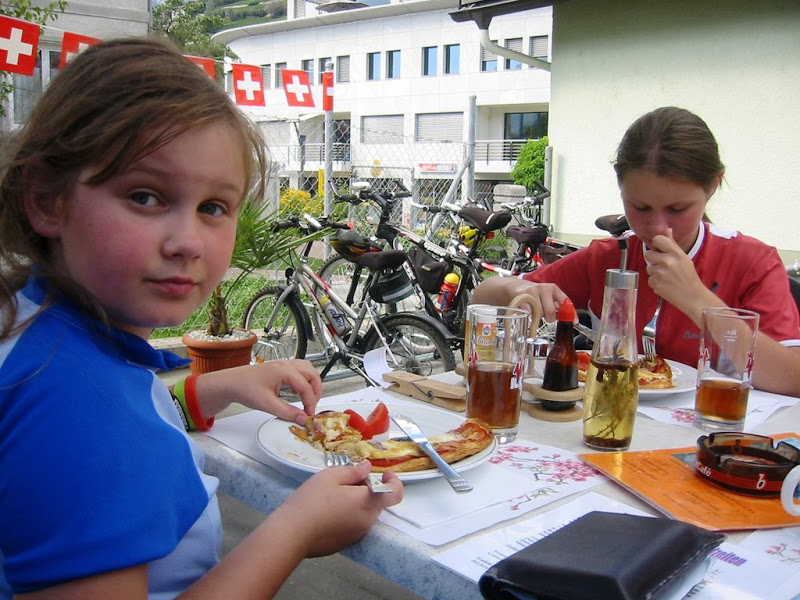 French breakfast. Various jams, rolls. Leaving the city wisely. Then we look for a trail. We ask at the gas station. We find the signs and run. On the way we buy drinks and food at the supermarket. It's a little late for lunch, but we find a sign on the bike trail to a restaurant that surely has something suitable for us for dinner. There are many interesting items on the menu, but the waitress, who doesn't speak any other language than French, says that now we can only order Walliser Teller. This is an expensive figure, but we hope that at least now we will eat. Yep, we get 4 plates full of slices of ham and sausage, a bit of cheese, tomatoes and cucumbers. Then we drive for a long time. We pass Sion, Martigny, where the Rhône valley changes direction from west to north. Evening is approaching. We find accommodation in bungalows near the town of Saint-Maurice. We also buy orangeade and beers for bedtime. Everyone loves this place.